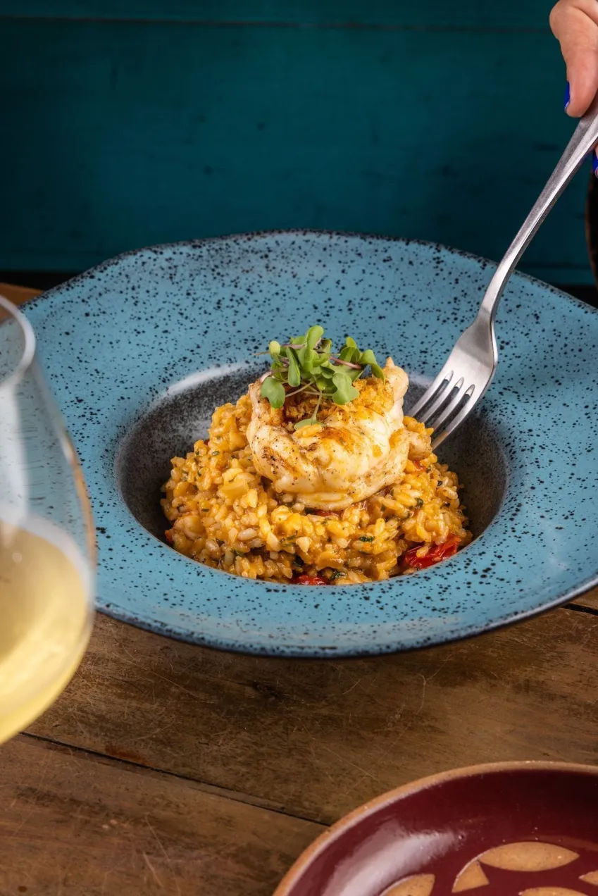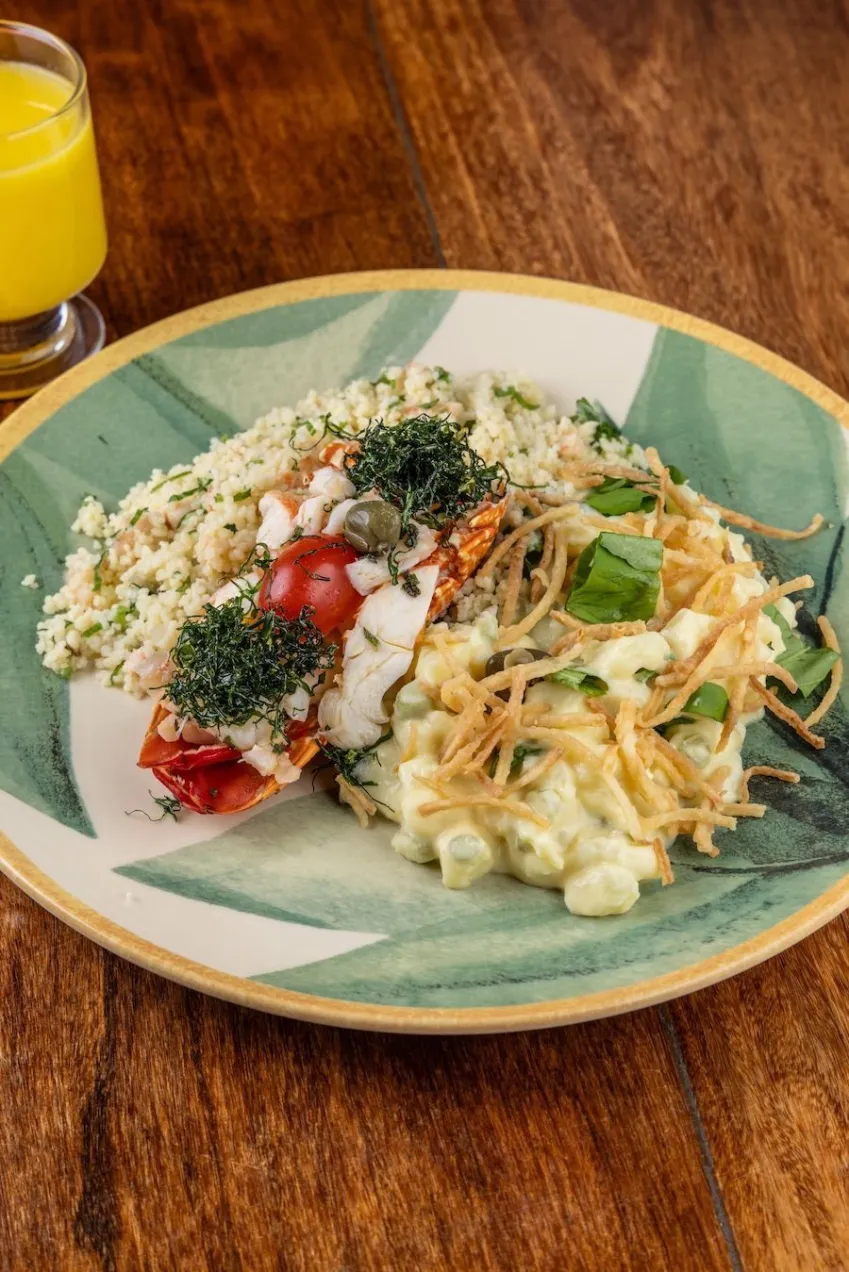 Arroz de lagosta na brasa: arroz pérola, molho de moqueca, lagosta na brasa e farofa cítrica.