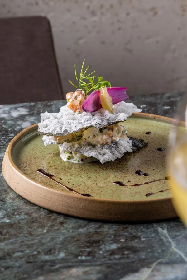 Folheado de Lagosta com algas crocantes: salada de lagosta com maionese do chef e folhas de alga nori crocante.