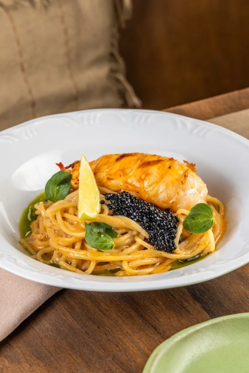 Lagosta grelhada com espaguete ao molho de capim-limão, ovas de mujol e limão fresco.