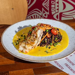 Lagosta ao aji amarilho com arroz negro colorido e vinagrete trufado.