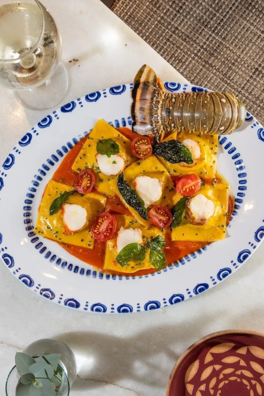 Ravioli de lagosta: recheio de cebola caramelizada, alho-poró, tomilho e batata assada ao molho de pomodoro confit e perfume de limão-siciliano.